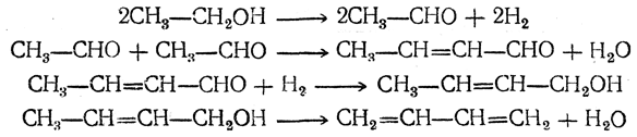 Первым технически целесообразным путем получения бутадиена из спирта является способ С. В. Лебедева, впервые осуществленный в промышленных масштабах в СССР в 1932 г. и в дальнейшем получивший широкое распространение. По С. В. Лебедеву спирт непосредственно превращается в бутадиен при пропускании его паров при 400—500° С над катализатором, обладающим одновременно дегидрирующим и дегидратирующим действием. Суммарно процесс выражается уравнением