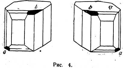 Первое свойство — способность этих веществ кристаллизоваться в так называемых энантиоморфных формах, т. е. в асимметрических формах, относящихся друг к другу (так же, как и сами стереоизомерные молекулы), как предмет к зеркальному изображению (рис. 4). Плоскость а находится у одного кристалла справа, а у другого слева, и их нельзя совместить никаким вращением (это же справедливо и относительно плоскости b).