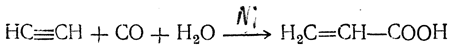 Проще получать акриловую кислоту омылением акрилонитрила (см. ниже). Промышленное применение имеет также способ непосредственного получения акриловой кислоты конденсацией ацетилена с окисью углерода и водой в присутствии никелевого катализатора: