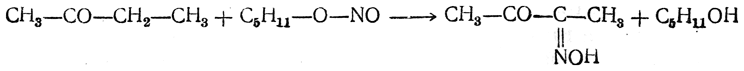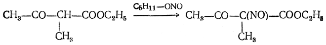 Вероятно, сначала получается неспособное к длительному существованию истинное нитрозосоединение СН3СО—CH(NO)—СН3, превращающееся (явление таутомерии) в изонитрозосоединение. Обыкновенно для реакции берут ее кетоны, а гомологи ацетоуксусного эфира, например:
