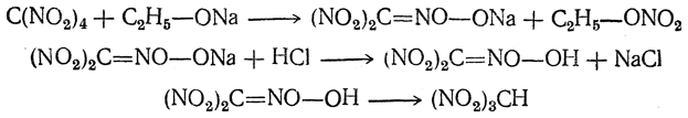Тринитрометан, или нитроформ, CH(NO2)3 — тяжелая бесцветная жидкость, застывающая в кристаллы при +15°С, перегоняющаяся в вакууме при 45°С и 20 мм рт. ст., довольно хорошо растворимая в воде. Нитроформ получается действием спиртовых растворов едких щелочей на тетранитрометан с последующим выделением из образующихся солей действием кислот: