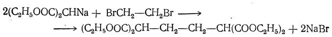 г) Синтез многоосновных кислот при помощи д и галоидных производных парафиновых углеводородов. При взаимодействии дигалоидных производных с натриймалоновым эфиром и его гомологами в реакцию вступают две молекулы натриймалонового эфира, например: