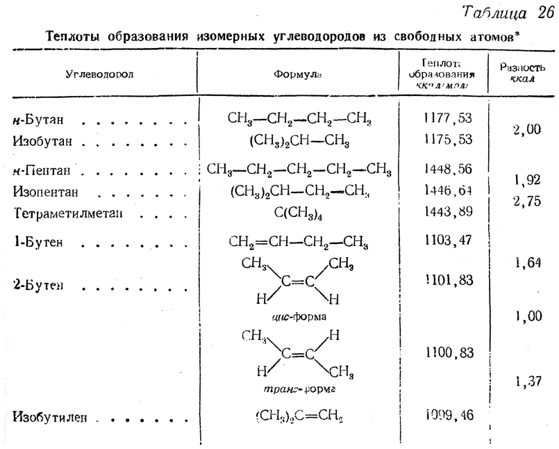 Новейшие методы позволяют определять теплоты горения с настолько большой точностью, что в настоящее время уже можно судить о разницах теплот образования многих изомерных соединений (табл. 26).