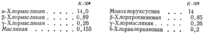Введение галоида, в частности хлора, в радикал карбоновой кислоты ослабляет связь протона с кислотным остатком, что объясняется полярным характером связи С—Сl в замещенном радикале кислоты. Благодаря этому, например, в хлоруксусной кислоте электронная пара, связывающая атом углерода группы CH2Cl с углеродным атомом карбонильной группы, несколько смещается по направлению к атому хлора. Такое смещение вызывает в свою очередь смещение электронов, связывающих этот атом углерода с кислородным атомом, в результате чего ослабляется связь протона с атомом кислорода: