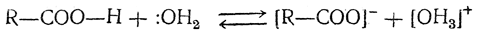 Ионизация карбоновых кислот заключается в обратимом удалении протона — ядра атома водорода — из карбоксильной группы кислоты под влиянием молекулы растворителя (воды):