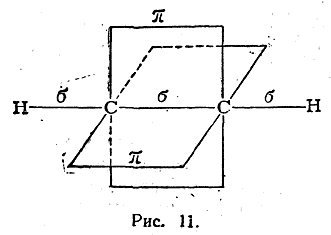 В молекуле ацетилена углерод находится в третьем валентном состоянии. В этой молекуле все четыре атома расположены на одной прямой и углы между σ-связями составляют 180° (sp-гибридизация). Электронные облака двух π-связей расположены вдоль пересекающихся взаимно-перпендикулярных плоскостей (рис. 11). Таким образом, согласно изложенным выше наглядным представлениям, две углерод-углеродные связи в молекуле этилена и три — в молекуле ацетилена по своему электронному строению не одинаковы. До сих пор, однако, не известно никаких химических или физических экспериментальных фактов, которые могли бы подтвердить это различие. Тот факт, что углеродные атомы, связанные двойными связями, способны легко присоединять только два атома водорода, галоида и т. п., так что одна из углерод-углеродных связей сохраняется, легко согласуется также и с предположением, что обе углерод-углеродные связи одинаковы. В самом деле, если по одной из таких одинаковых углерод-углеродных связей присоединяются, например, два атома водорода, то в результате этого характер второй оставшейся углерод-углеродной связи может измениться иона, отличаясь от двух имевшихся кратных связей в исходном соединении, может быть прочнее, чем каждая из них. На основе такого предположения можно объяснить, почему двойная связь легко присоединяет только два, а тройная — только четыре эквивалента.