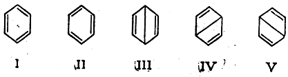 Для того чтобы облегчить расчет волновой функции ψ, отдельные слагаемые (C1ψ1, C2ψ2 и т. д.) условно изображаются графически в виде соответствующих валентных схем, которые используются как вспомогательные средства при математическом расчете. Например, когда указанным способом рассчитывают молекулу бензола и принимают во внимание только π-элек-троны, то таких слагаемых получается пять. Этим слагаемым соответствуют следующие валентные схемы: