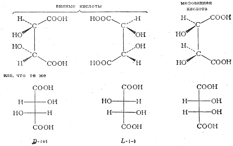Сравнивая выведенную этим путем проекционную формулу (+)-винной кислоты с установленной на основании рентгеноструктурных данных ее пространственной формулой, можно легко убедиться, что сделанный ранее произвольный выбор проекционной формулы (+)-глицеринового альдегида случайно оказался правильным. Следовательно, абсолютные конфигурации теперь уже не являются условными, а правильно отражают истинное пространственное строение молекул.