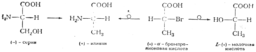 Как показывают кинетические измерения, обе реакции нуклеофильного замещения при асимметрическом центре (+)-α-бромпропионовой кислоты протекают по бимолекулярному механизму и, следовательно, сопровождаются вальденовским обращением (в схеме это показано кружком на стрелке, указывающей направление реакции). Двойная инверсия равноценна сохранению конфигурации, и поэтому (+)-аланин, а следовательно, и (—)-серии должны быть отнесены к тому же L-ряду, что и (+)-молочная кислота, в то время как (+)-α-бромпропионовая кислота относится к D-ряду.