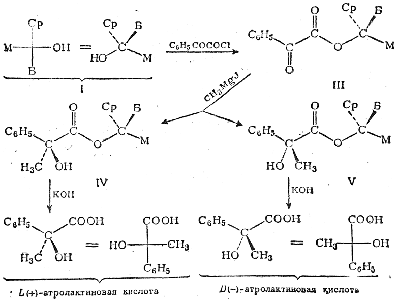 Если при помощи хлорангидрида фенилглиоксиловой кислоты превратить спирт I в кетоэфир III и подействовать на него реактивом Гриньяра, то образуются сложные эфиры L(+)- и D(—)-форм атролактиновой кислоты (IV и V):