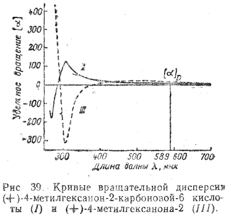 Спектрополяриметрический метод основан на изучении физического свойства, наиболее характерного для каждого асимметричного вещества, а именно его оптической активности. Раньше уже указывалось, что направление вращения плоскости поляризации света само по себе не определяет принадлежности соединения к D- или L-ряду. Если два сходных по структуре вещества имеют не только одинаковые по знаку, но и близкие по величине [α]D, это также не означает, что они обладают одинаковым пространственным строением. Идентичность конфигураций этих веществ может быть установлена лишь путем измерения их оптической активности на протяжении всей видимой и доступной ультрафиолетовой частей спектра и сравнения получающихся при этом кривых зависимости величины вращения от длины волны (так называемых кривых вращательной дисперсии). Например, полученная из природного антнбиотика актидиона (+)-4-метилгексанон-2-карбоновая-6 кислота имеет примерно такое же значение [α]D, как (+)-4-метилгексанон-2, для которого установлена абсолютная конфигурация III: