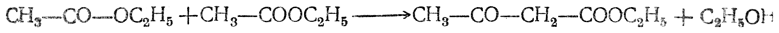 Чрезвычайно большой теоретический интерес и большое значение для синтезов имеет этиловый эфир ацетоуксусной кислоты, обыкновенно называемый просто ацетоуксусным эфиром. Он образуется при конденсации двух молекул уксусноэтилового эфира, причем конечный результат реакции можно выразить уравнением