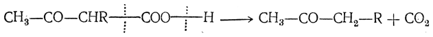 Разбавленные щелочи на холоду омыляют эфиры β-кетонокислот, причем получается спирт и соль β-кетонокислоты. При нагревании соль и особенно легко — свободная кислота, получающаяся при подкислении раствора соли, распадаются на СО2 и кетон (кетонное расщепление β-кетонокислот):