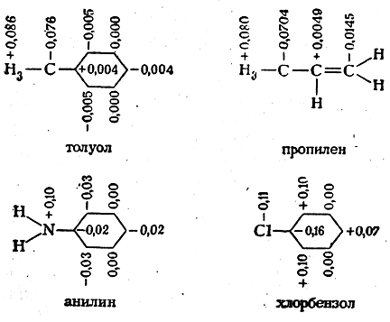 Метод молекулярных орбит успешно применяется для получения картины распределения π-электронной плотности в молекуле. В настоящее время для многих молекул рассчитаны так называемые молекулярные диаграммы, в которых указываются электронные, или эффективные, заряды, характеризующие относительную величину электронной плотности вокруг данного атома, кратности связей и индексы свободной валентности атомов, отражающие степень их ненасыщенности. На приведенных ниже молекулярных диаграммах толуола, пропилена, анилина и хлорбензола указаны значения электронной плотности у атомов углерода, азота, хлора: