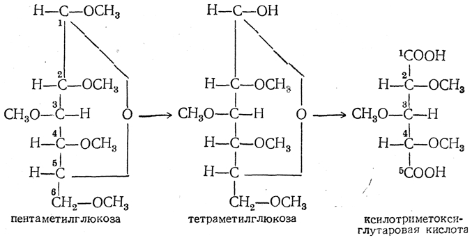 Хеуорс разработал следующий метод определения строения кольца. В молекуле моносахарида, например глюкозы, замещают во всех гидроксильных группах атомы водорода на метильные группы. Полученное пентаметильное производное гидролизуют разбавленной кислотой. При этом гидролизуется только метоксильная группа у первого атома углерода, тогда как метоксильные группы у остальных углеродных атомов, связанные по типу простых эфиров, в этих условиях не гидролизуются. Из продуктов окисления полученной тетраметилглюкозы азотной кислотой выделена в виде диамида триметоксиглутаровая кислота (один из ее изомеров — ксилотриметоксиглутаровая кислота):