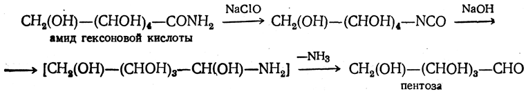Подобный же переход осуществляется при действии на амиды альдоновых кислот солями хлорноватистой кислоты (в щелочной среде), например: