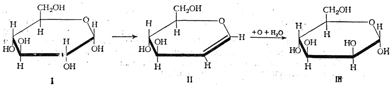 Так, например, при окислении перекисью бензоила гликаля (II), полученного из D-глюкозы (I), может образоваться эпимерная D-глюкозе D-манноза (III):