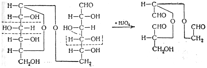 Периодатный метод, широко применяемый в последнее время в химии высших полиоз, дает возможность, в частности, отличить в дисахаридах связи 1,4' и 1,6' При действии йодной кислоты на дисахарид, содержащий связи 1,4', выделяется иод, тогда как при наличии связи 1,6' иод не выделяется. Выделение иода из иодной кислоты обусловлено, по-видимому, восстанавливающим действием образующегося редуктона О=СН—СН(ОН)—СН=О: например мальтоза (связь 1.4') в аль-форме реагирует с иодной кислотой: