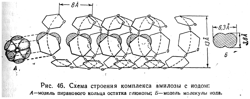 Цепь амилозы в виде спиралей обвивает молекулы иода, располагающиеся по оси спиралей (рис. 46); при этом на каждую молекулу иода приходится шесть глюкозных остатков.