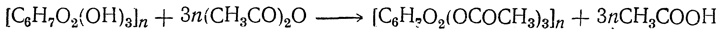 Уксуснокислые эфиры (ацетаты целлюлозы), часто неправильно называемые ацетилцеллюлозой, получаются этерификацией целлюлозы уксусным ангидридом в присутствии уксусной кислоты и небольших количеств серной кислоты как катализатора, например: