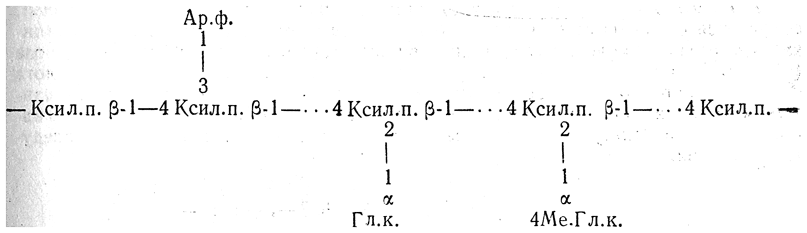 Один из наиболее хорошо изученных «ксиланов» из овсяной соломы имеет основную цепь из ксилопиранозных остатков (Ксил.п.), соединенных β-1,4'-связями. К этой цепи в качестве ответвлений присоединены при помощи 1,3'-связей остатки арабофуранозы (Ар.ф.) и при помощи α-1,2'-связей — остатки глюкуроновой кислоты (Гл.к.) и ее 4-метилпроизводного (4Ме.Гл.к.), что обозначают следующей схемой: