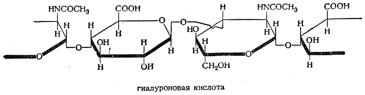 Мукополисахариды получили свое название потому, что ряд веществ этого класса имеет слизистую консистенцию (тисоr — лат. слизь). Для мукополисахаридов характерно наличие в их молекулах значительного количества остатков аминосахаров и уроновых кислот. Мукополисахариды обычно связаны с белками, образуя солеобразные или более прочно построенные (за счет ковалентных связей) соединения. Важнейшими представителями этой группы гетерополисахаридов являются гиалуроновая кислота, хондроитинсерные кислоты и гепарин.