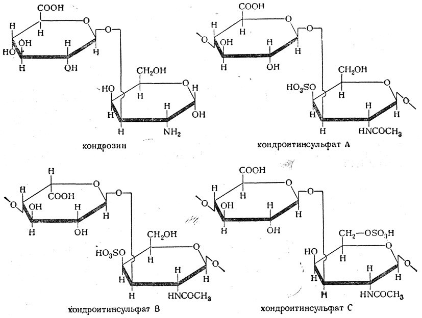 Хондроитинсульфаты А и С (из хрящей, трахеи, костей, аорты и т. д.) дают при гидролизе приблизительно эквимолекулярные количества галактозамина, глюкуроновой, серной и уксусной кислот. При частичном гидролизе можно выделить из них так называемый хондрозин — азотсодержащую альдобиуроновую кислоту, в молекуле которой уроновая кислота связана с альдозой β-1,3' -связью (Мазамуне, К. Мейер).