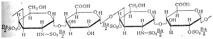 Структурной единицей молекулы гепарина является тетрасахарид, состоящий из остатков глюкозамина и глюкуроновой кислоты и содержащий пять остатков серной кислоты (Уолфром и др.). Три остатка серной кислоты содержатся в виде сложных эфиров, и два связаны с аминогруппами по типу сульфаматов (сульфаматы — соли или эфиры сульфаминовой кислоты R —NH—SO2OH).