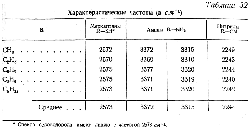 Для некоторых функциональных групп можно приурочить в спектрах комбинационного рассеяния узко определенный, характерный для присутствия этих групп в молекуле интервал частот. Об этих характеристических частотах дают представление, например, данные, приведенные в табл. 32.