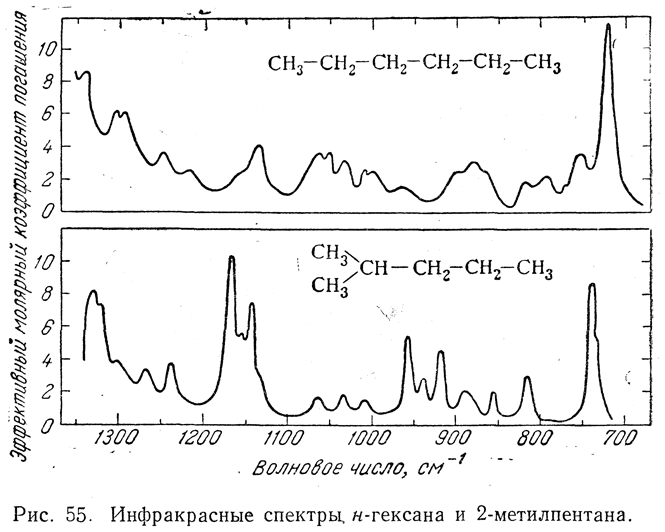 Частоты ординарных связей С—С лежат между 800 и 1200 см–1. Однако в тот же интервал попадают частоты связей С—О 1032 см–1 для СН3ОН), С—N (1037 см–1 для CH3—NH2), С—F (1040 см–1 для СН3—F). Отличить и приурочить линии с частотами в этой области (800—1200 см–1) для более сложных органических соединений оказывается затруднительным.