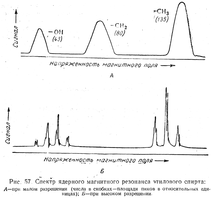 окружение), дают сигнал ЯМР (резонансный эффект) при различных значениях напряженности постоянного магнитного поля. Так, например, в спектре ЯМР этилового спирта (рис. 57, А) видны три пика, соответствующие атомам водорода в трех разных магнитных окружениях (СН3, СН2 и ОН). Площади пиков находятся в отношении 3:2:1 соответственно числу атомов водорода в этих группах.