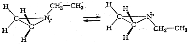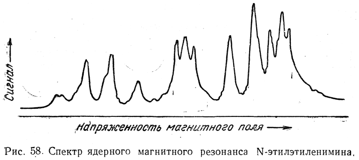 На рис. 58 приведена для примера спектрограмма ЯМР для N-этилэтиленимина. Эта спектрограмма привела к интересным выводам, что в молекуле N-этилэтиленимина атом азота и непосредственно с ним связанные три атома углерода не лежат в одной плоскости и взаимные превращения (инверсии) типа