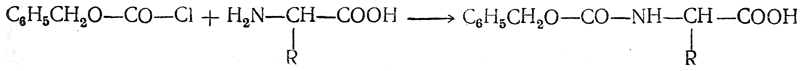 1. Образование карбобензоксипроизводных. Наиболее распространенный способ защиты аминогруппы, предложенный Бергманом и Зервасом (1932), заключается в ацилировании ее бензиловым эфиром хлоругольной кислоты — карбобензоксихлоридом. При обработке аминокислоты или пептида карбобензоксихлоридом в щелочной среде получается соответствующее карбобензоксипроизводное (бензилоксикарбонилпроизводное):