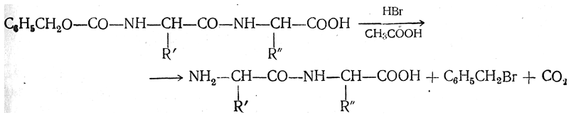 Карбобензоксигруппа может быть отщеплена также действием бромистого водорода, растворенного в ледяной уксусной кислоте: