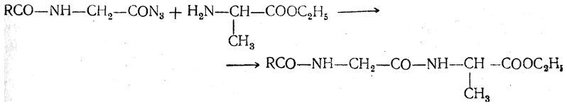 2. Применение азидов. Азиды N-замещенных аминокислот (или пептидов) легко взаимодействуют с эфирами аминокислот и пептидов, образуя эфиры N-замещенных пептидов;