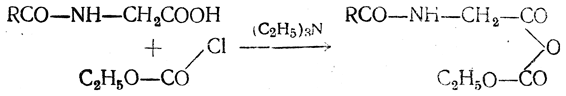 3. Применение смешанных ангидридов (Виланд, Буассона; Воган). При действии эфиров хлоругольной кислоты на N-замещенные аминокислоты в присутствии третичных аминов образуются смешанные ангидриды аминокислоты и соответствующего эфира угольной кислоты: