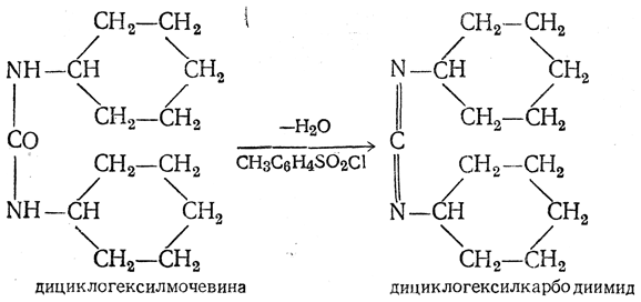 5. К а р б о д и и м и дн ы й метод. Для синтеза пептидов этим способом обычно употребляют дициклогексилкарбодиимид, получаемый дегидратацией дициклогексилмочевины п-толуолсульфохлоридом:
