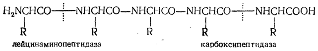 Большое значение приобрел ферментативный метод определения С-концевой последовательности аминокислот. Для этой цели используют фермент карбоксипептидазу, выделяемую из поджелудочной железы крупного рогатого скота. Карбоксипептидаза гидролизует только те пептидные связи, которые образованы С-концевой аминокислотой, имеющей свободную α-карбоксильную группу. Поэтому под действием этого фермента от пептида последовательно отщепляются аминокислоты, начиная с С-концевой. Это позволяет определить взаимное расположение чередующихся аминокислотных остатков.