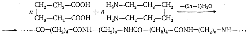 При поликонденсации адипиновой кислоты с гексаметилендиамином получается полигексаметиленадипамид, широко известный под названиями найлон и анид: