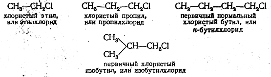 Алкилы первого рода называются первичными, второго—вторичными (перед названием радикала обычно пишут втор-) и третьего — третичными (сокращенно трет-). В качестве примеров простейших галоидных соединений с такими радикалами можно назвать соединения: