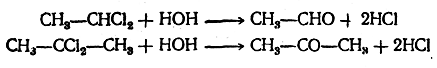 Соединения же типа хлористого этилидена СН3—СНCl2, содержащие два атома галоида у одного и того же атома углерода, обыкновенно обменивают при реакциях сразу оба атома галоида, например при действии воды: