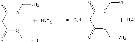Диэтиловый эфир малоновой кислоты (80,0 г, 0,5 моля) помещают в трехгорлую колбу емкостью 500 мл, снабженную капельной воронкой, мешалкой, термометром и трубкой для отвода газа, которая защищена осушительной трубкой. Содержимое колбы охлаждают до 12 С водопроводной водой прямо под краном и затем прибавляют в течение 1 часа 184 мл дымящей азотной кислоты (уд. вес 1,5) со скоростью, достаточной для того, чтобы поддерживать температуру от 15 до 20 С. После этого смесь перемешивают еще 3,5 часа при 15 С. Затем раствор выливают в 1 л смеси льда и воды, после чего полученный эфир экстрагируют толуолом, порциями по 200 и 100 мл. Объединенные толуольные экстракты дважды промывают водой, а затем 5%-ным водным раствором карбамида порциями по 200 мл до отрицательной пробы промывной жидкости по иодкрахмальной бумажке на содержание окислов азота. Толуольный раствор экстрагируют несколько раз 10%-ным водным раствором соды до тех пор, пока проба, взятая из экстракта, не будет больше содержать нитроэфира. Содовые экстракты соединяют и промывают один раз 200 мл толуола. После этого водный раствор тщательно подкисляют концентрированной соляной кислотой по индикаторной бумажке конго красный; при этом для охлаждения периодически добавляют лед. Чтобы выделить нитроэфир, смесь экстрагируют толуолом порциями по 500, 200 и 100 мл. Толуольный раствор промывают двумя порциями воды по 200 мл, а затем 5%-ным водным раствором карбамида, причем вновь проверяют по иодкрахмальной бумажке, чтобы полностью отсутствовали окислы азота. Толуольный раствор высушивают сернокислым магнием.