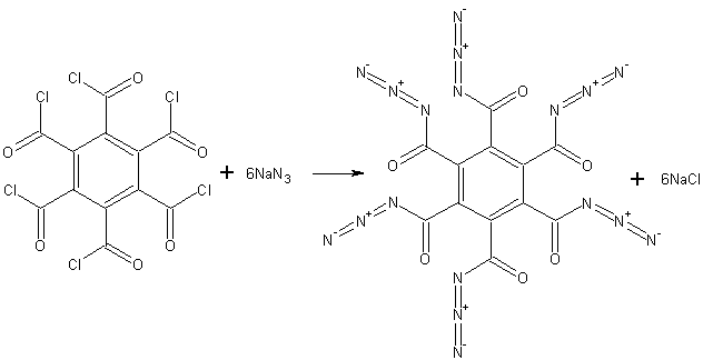 В трехгорлую круглодонную колбу, снабженную мешалкой, термометром, капельной воронкой и погруженную в баню со льдом, помещают 10%-ный раствор азида натрия. К нему медленно прибавляют суспензию гексахлорангидрида меллитовой кислоты в ацетоне. Температуру реакционной массы поддерживают около 8 С при перемешивании в течение 1 ч. К концу реакции смесь расслаивается. Нижний слой - суспензия гексаазида меллитовой кислоты. Из-за сильной взрывчатости в сухом виде свойства определить трудно.