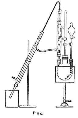 Литровую круглодонную трехгорлую колбу снабжают холодильником Аллина и капельной воронкой, ножка которой доходит до Дна колбы. Верхняя часть холодильника Аллина соединена с помощью согнутой стеклянной трубки с холодильником Либиха, конец которого погружен в смесь льда и соли (около 800 г), помещенную в стакан емк. в 2 л (примечание 1).