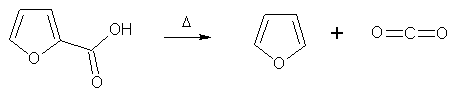 В колбу А помещают 80 г (0,71 моля) фуран-2-карбоновой (пирослизевой) кислоты с т. пл. 128—132°С и нагревают ее до 200—205°С; в этом температурном интервале происходит равномерное декарбоксилирование пирослизевой кислоты. Нагревание продолжают 4—5 часов; к концу этого времени остается незначительное количество жидкости, а на верхних частях стенок колбы оседает слой сублимировавшейся пирослизевой кислоты. Для разложения оставшейся кислоты температуру повышают до 210—215 С, одновременно прикрывая верхние части колбы листами асбеста. При этом некоторая часть пирослизевой кислоты, возгоняясь, осаждается на стенках трубки В; время от времени ее сбрасывают стеклянной палочкой Г обратно в колбу. К концу опыта стенки колбы и нижняя часть вертикальной трубки остаются покрытыми тонким налетом пирослизевой кислоты.