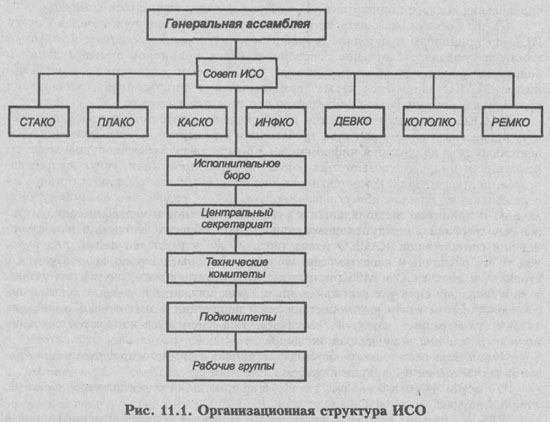 Организационная структура. Организационно в ИСО входят руководящие и рабочие органы (рис. 11.1). Руководящие органы: Генеральная ассамблея (высший орган), Совет, Техническое руководящее бюро. Рабочие органы — технические комитеты (ТК), подкомитеты, технические консультативные группы (ТКГ).