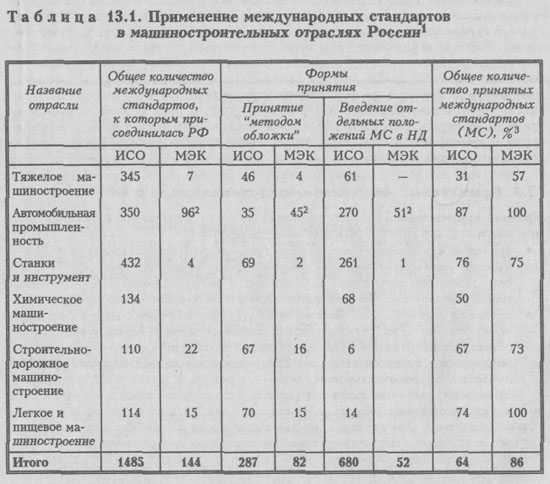Применение международных стандартов в машиностроении. Наиболее актуальным направлением по использованию международных стандартов в РФ считается машиностроение, где из 4988 действующих стандартов более 2000 — международные. Данные по различным машиностроительным отраслям приведены в табл. 13.1.