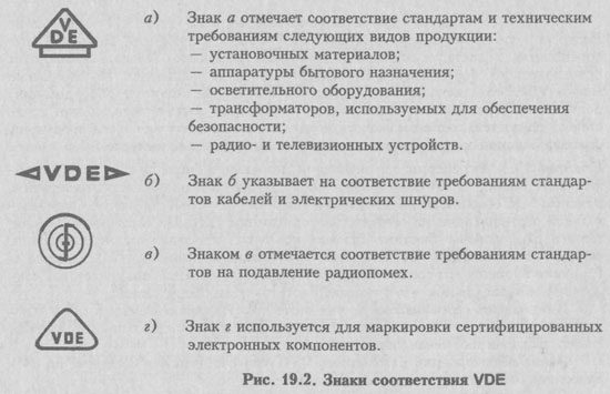 Контроль за правильностью маркировки знаками VDE (рис. 19.2) осуществляет Центр по испытаниям и сертификации VDE-Prufstelle. Сертификат, выданный этой организацией, гарантирует соответствие продукции требованиям Закона о безопасности промышленного оборудования или Закона о защите от радиопомех. Использование знаков VDE без лицензии этого Центра запрещено. Изготовитель оборудования, получивший сертификат и право маркировки знаком соответствия, обязан представить доказательства возможности поддерживать соответствие своей продукции сертификационным требованиям в течение всего времени ее выпуска. Система A3 — это система сертификации Ассоциации фирм по газо- и водоснабжению Германии - DVGW. Газовое оборудование в Германии в соответствии с Законом "Об обеспечении безопасности технических устройств" подлежит обязательной сертификации на соответствие стандартам DIN. He сертифицированное газовое оборудование местные газовые компании отказываются подключать к системе газоснабжения. Особенностью требований к газовому оборудованию в Германии является его соответствие тому типу газа, который применяется в конкретной области страны, что учитывают изготовители оборудования.