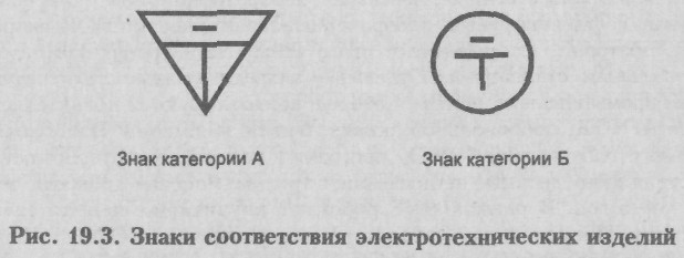 По некоторым видам продукции в законах вводятся категории, характеризующие степень их опасности для пользователя. Например, для электротехнических изделий установлены категории А и Б. Для категорий используют разные схемы сертификации и знаки соответствия (рис. 19.3).