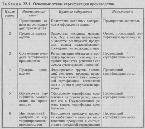 Основные этапы сертификации производства представлены в табл. 22.1.
